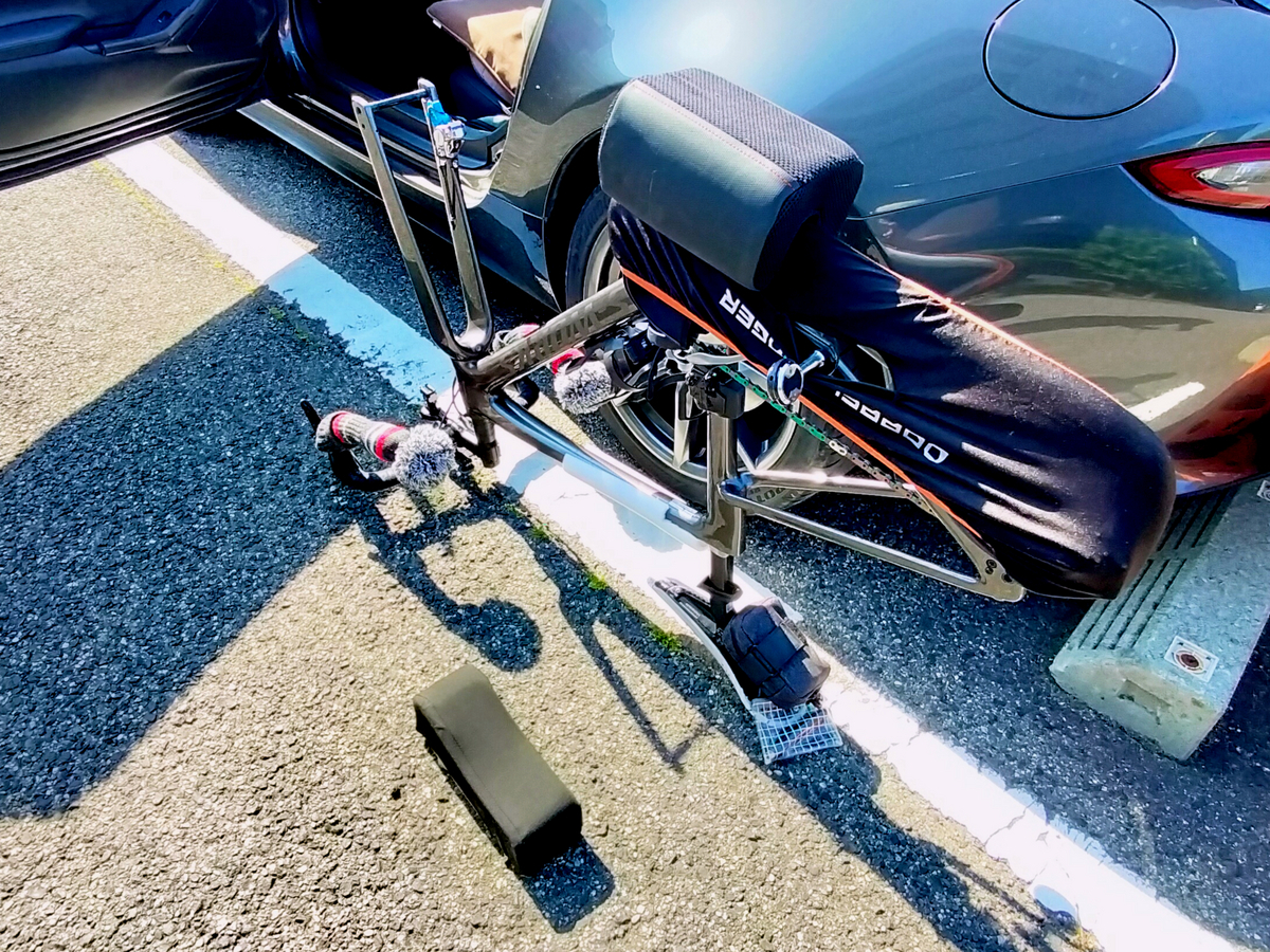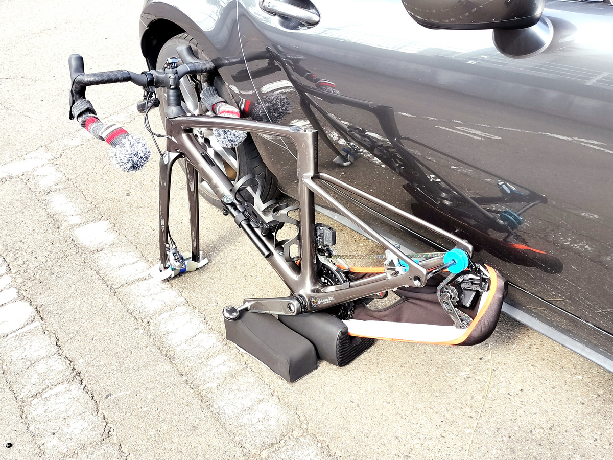 またシートポストを抜かないと助手席に搭載できないロードスターでの輪行においては、ポストを抜いたフレームを二種類のひじ掛けクッションを組み合わせて自立させ、ポストを差し込み仮締め