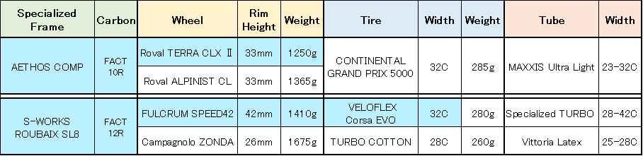 自分的にAETHOSとROUBAIXの剛性を比べると、同じ条件下で気持ちよく走ることが出来るのはAETHOSですが、早く走れるのはやはり剛性が高いROUBAIXです。しかし、剛性が高いROUBAIXで走ると足の消耗が早く、100kmライドでぎりぎり、130kmとかになると後半垂れることが予想されました。なので使用するホイールとタイヤの組み合わせを変えることで足の回し心地(=脚へのダメージ)を調整することにしました。